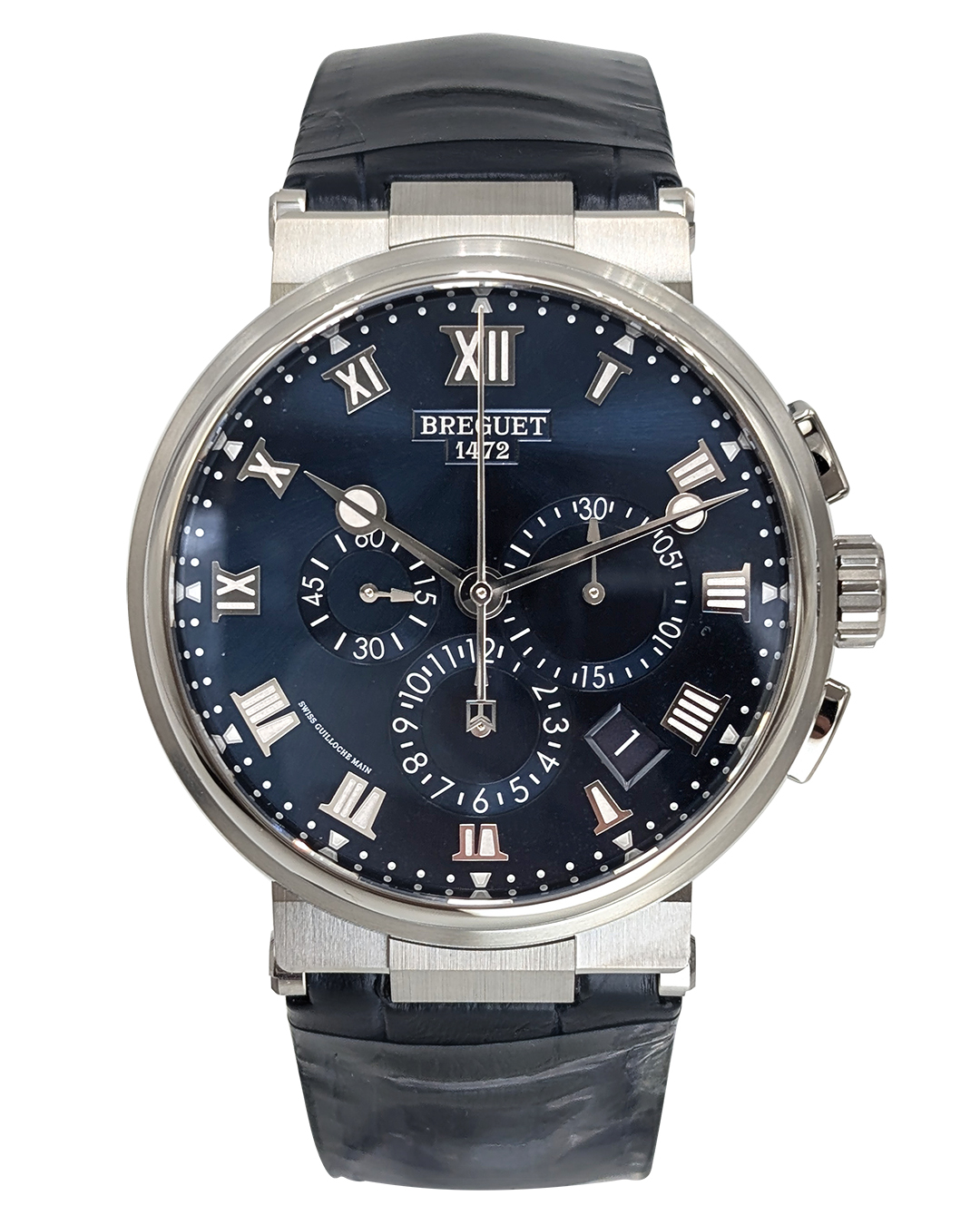 Breguet Marine Chronograph 42.3mm Titanium Case Blue Roman Dial Leather Strap Auto Men Watch