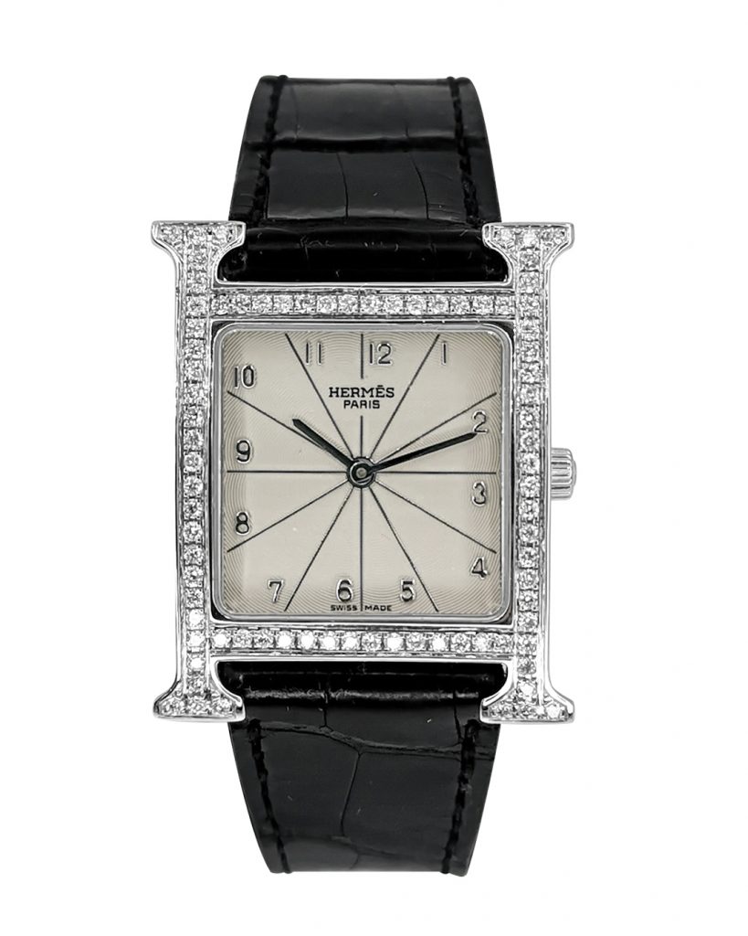 Hermes Heure H 26mm 18K White Gold CM Diamonds Bezel Leather Strap Quartz Lady Watch